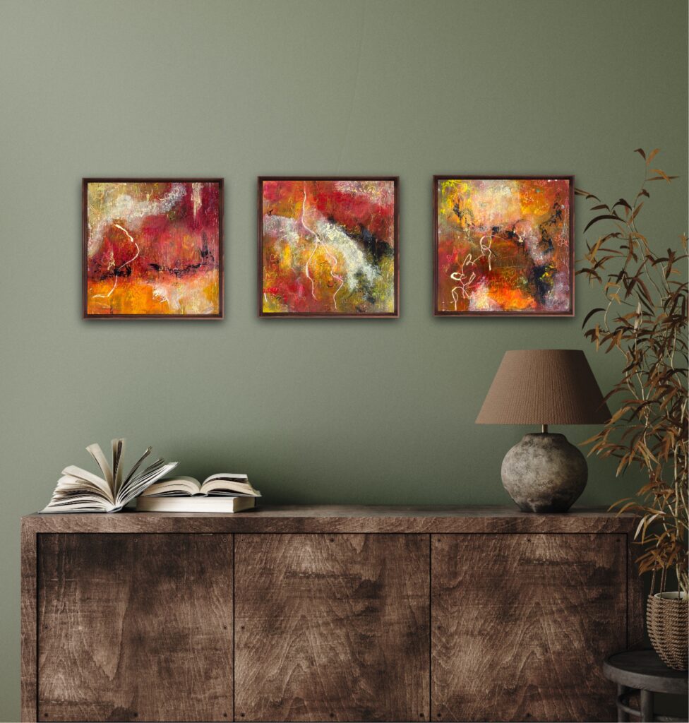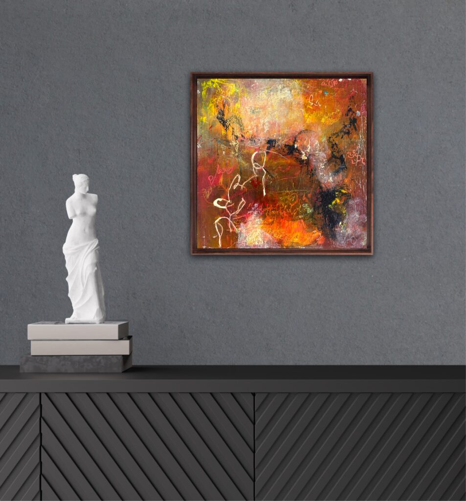 Standing at Sinai 3, with its fiery colours, has all the complexity, movement and energy of an electrical storm. Multiple layers of intriguing graffiti like marks and aesemic writing will pull you in closer every time you pass it.